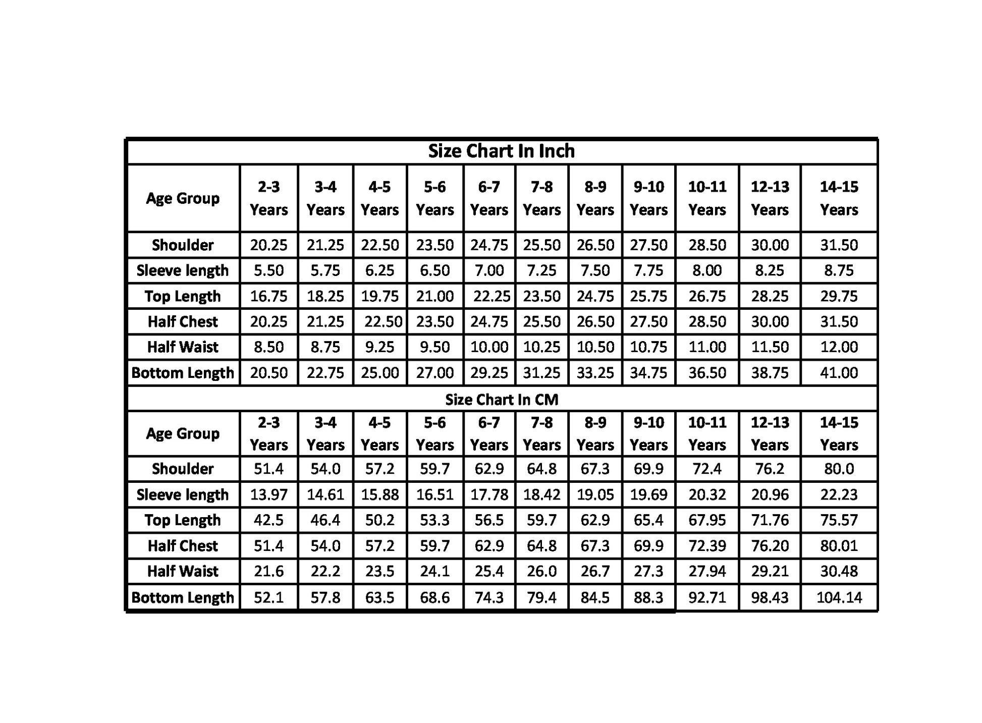 | Size Ages | Length | Chest (Half) | Shoulder | Bottom (Half) |