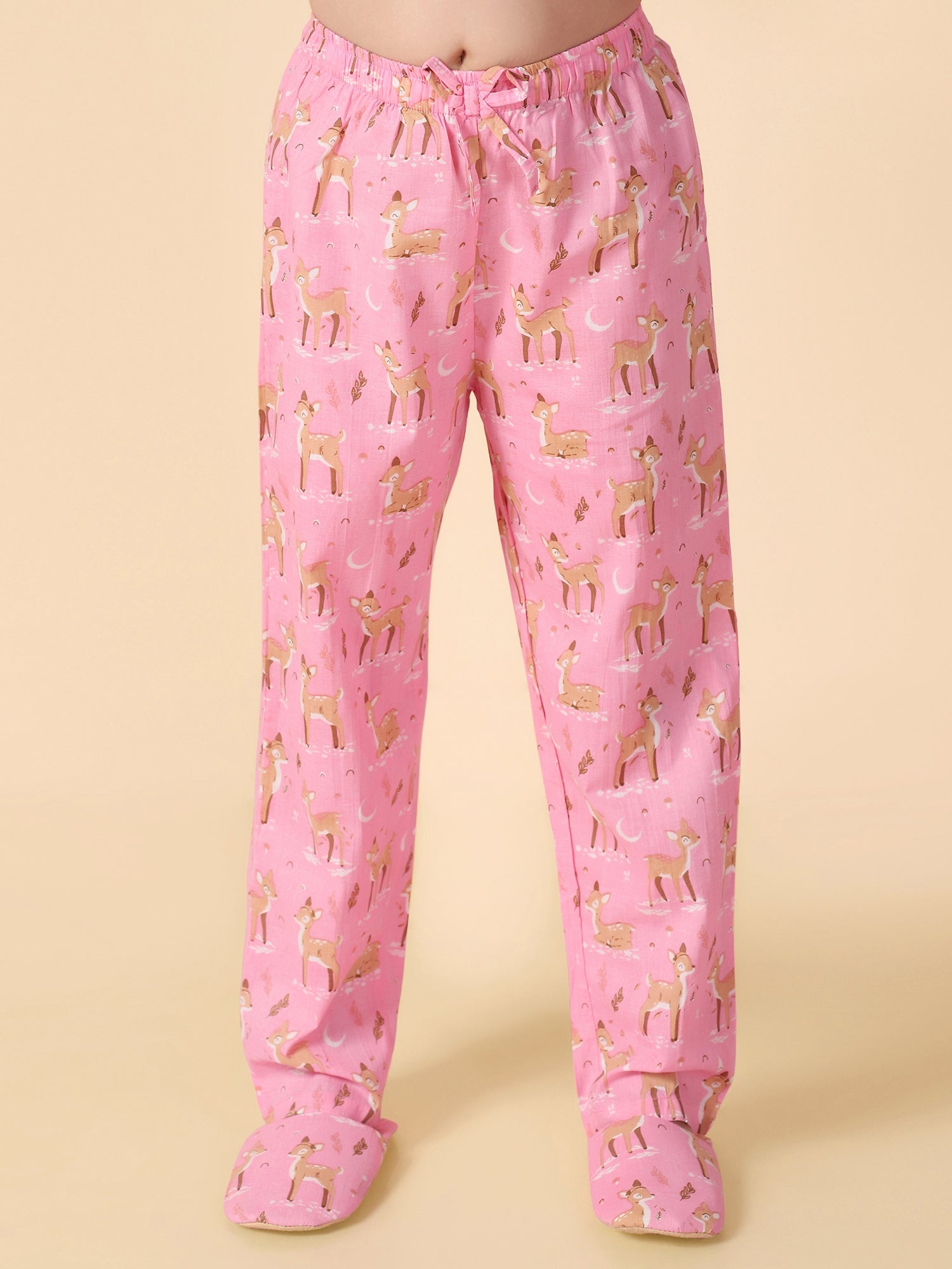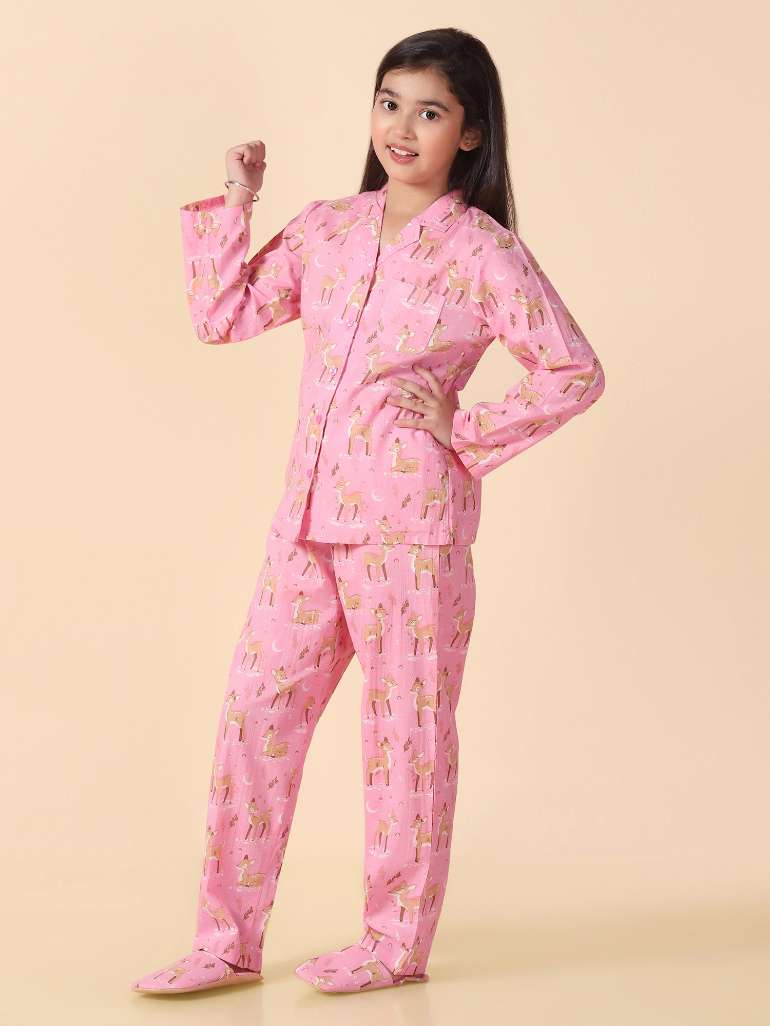 Girls Pink Reindeer Printed Pyjama Set with Slip Ons