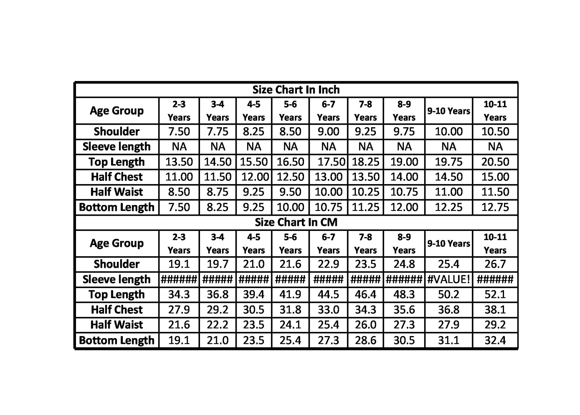 Size Chart For Girls Tops & Shorts / Skirts