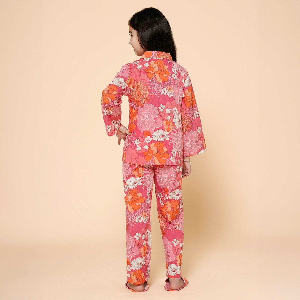 Girls Pink Cotton Floral Full Sleeves Pyjamas Set With Slip Ons